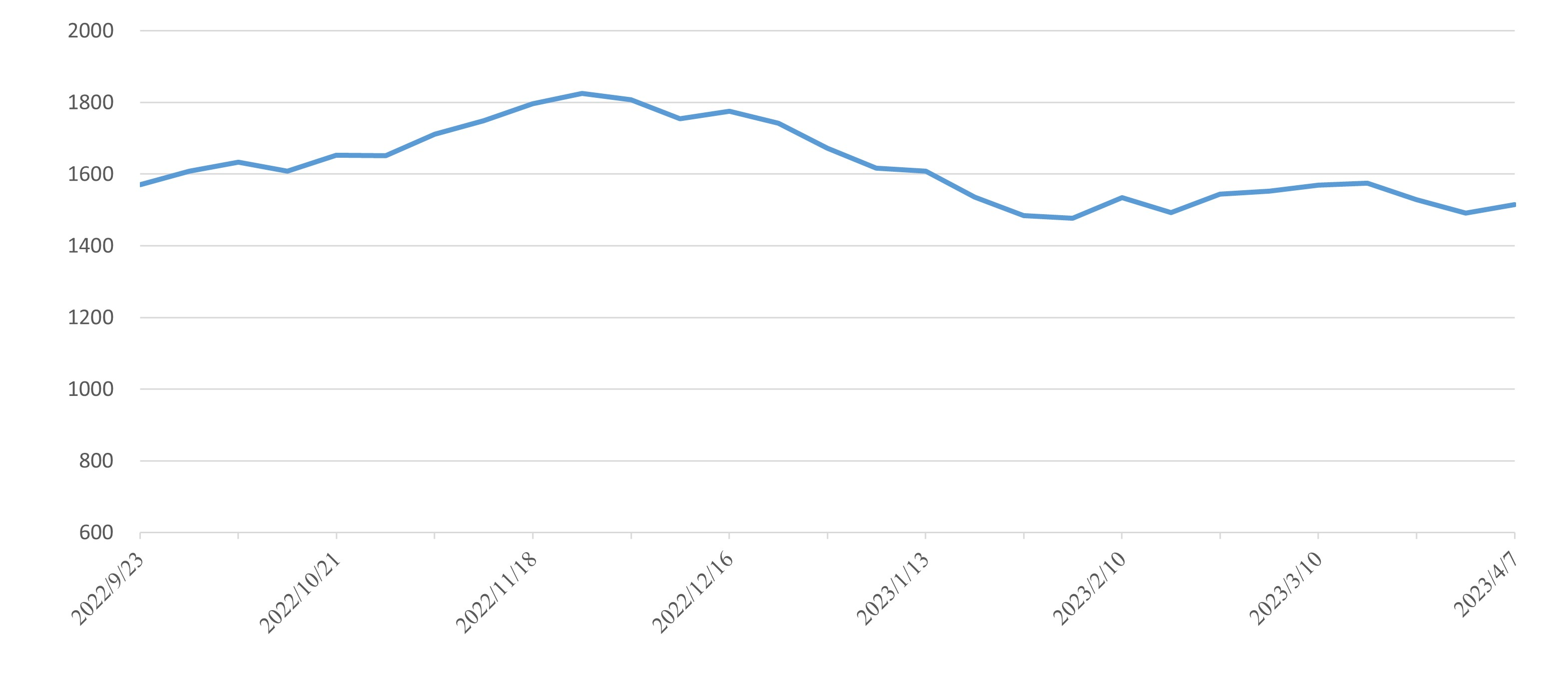 此外,华东指数报收1585点,环比下跌49点,跌幅3.00%;山东指数报收1388点,环比上涨85点,涨幅6.52%;福建指数报收1323点,环比下降78点,跌幅5.57%。