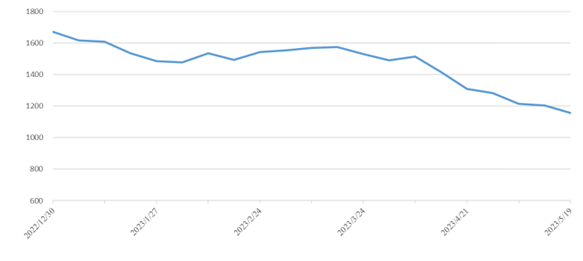 华南区域:受房地产行情震荡影响,陶瓷需求恢复不及预期开窑率在50%左右,导致出运量仍然处于低位。本期华南指数报收1546点,环比下跌7点,跌幅0.45%,其中华南至东北指数报收1059点,环比下跌37点,跌幅3.38%,华南至华北指数报收1429点,环比下跌20点,跌幅1.38%。